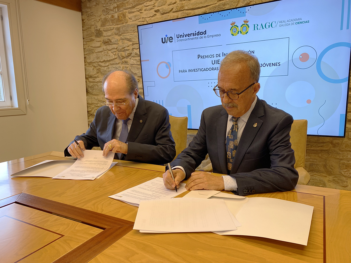 La Universidad Intercontinental de la Empresa (UIE) y la Real Academia Galega de Ciencias firmaron esta mañana en la Sede Institucional de la UIE en Santiago de Compostela (rúa Nova, 33), el convenio para la creación del próximo certamen de promoción del talento investigador en Galicia. Estos nuevos galardones, los Premios de Investigación UIE-RAGC para Jóvenes Investigadoras e Investigadores serán de periodicidad bienal y reconocerán el esfuerzo que en los campos de las ciencias técnicas, básicas y sociales desarrolla la juventud investigadora en los centros gallegos y que contribuye con su esfuerzo al avance del conocimiento científico. Al acto de rúbrica asistieron el rector de la UIE, Miguel Ángel Escotet, y el presidente de la Real Academia Gallega de Ciencias, Juan Manuel Lema Rodicio.